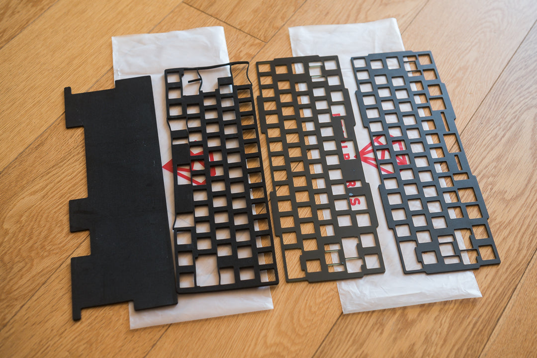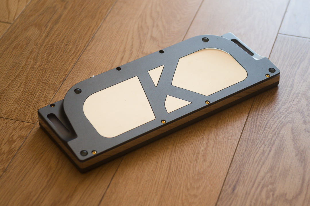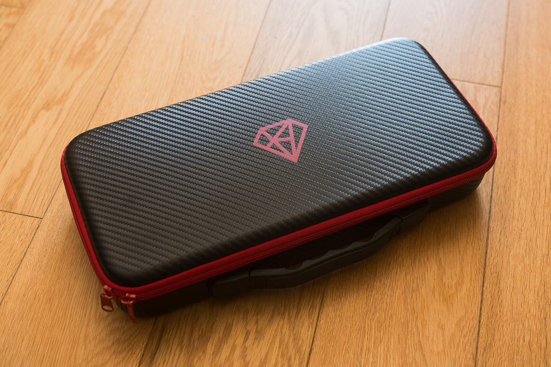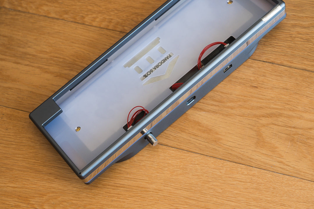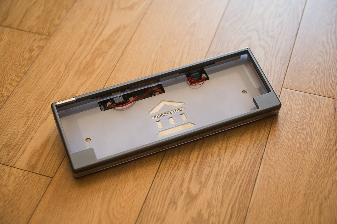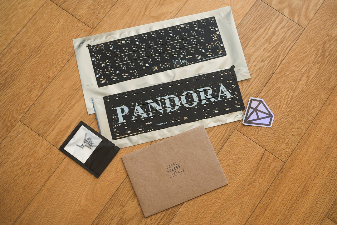 Used, unbuilt HHKB-layout Pandora in anodized space gray. Mirror-polished stainless steel weights/accents and rotary encoder. Includes an aluminum plate, FR4 plate, two PCBs, carrying case, and original packaging.